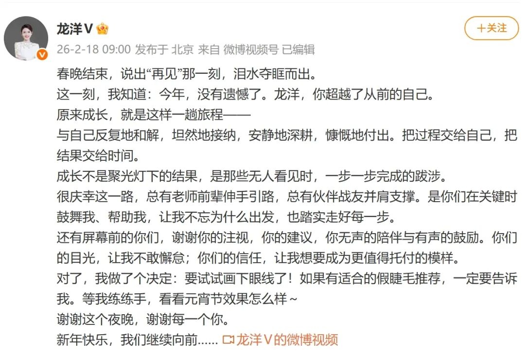 据潇湘晨报消息,2月18日,龙洋在社交平台发文:说出“再见”的那一刻,泪水夺眶而出。这是龙洋与除夕夜最动人的告别。